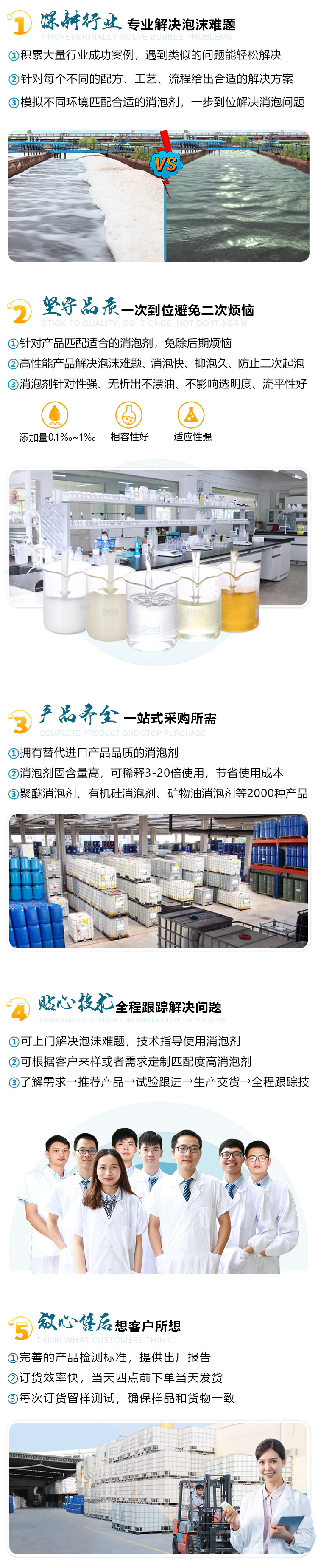 多年來(lái)公司面向市場(chǎng),面向真實(shí)各行業(yè)客戶現(xiàn)場(chǎng),對(duì)水處理消泡劑、工業(yè)消泡劑、有機(jī)硅消泡劑、發(fā)酵行業(yè)、清洗劑行業(yè)、金屬加工行業(yè)、造紙行業(yè)、建材行業(yè)、水性粘合劑行業(yè)、紡織印染行業(yè)、油田行業(yè)、水性涂料行業(yè)、印刷材料行業(yè)、電廠脫硫行業(yè)、工業(yè)清洗行業(yè)、家用化學(xué)品行業(yè)、采礦選礦工行業(yè)等32個(gè)行業(yè)工藝、流程及產(chǎn)品配方深入了解,對(duì)各行業(yè)消泡劑應(yīng)用了如指掌,給能客戶提供合適的解決方案,所研發(fā)生產(chǎn)消泡劑適應(yīng)客戶需求和市場(chǎng)需要,能輕松解決客戶遇到的難以解決的消泡難題,減少了客戶使用消泡劑的成本。公司依托完善的售前、售中及售后服務(wù),全程技術(shù)跟進(jìn)消泡劑的試樣到使用過(guò)程,節(jié)省了時(shí)間和成本,贏得了業(yè)界各類客戶們的贊譽(yù)!